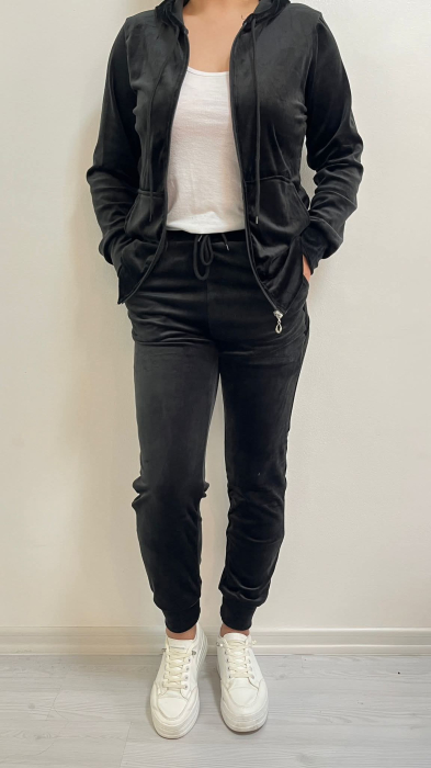 Trening de dama din catifea moale si calduroasa. Compleu format din 2 piese; Hanorac cu gluga si buzunare. Inchidere pe fermoar, Pantalon cu elastic si snur in talie. Pantaloni cu buzunare si croi conic cu manseta.